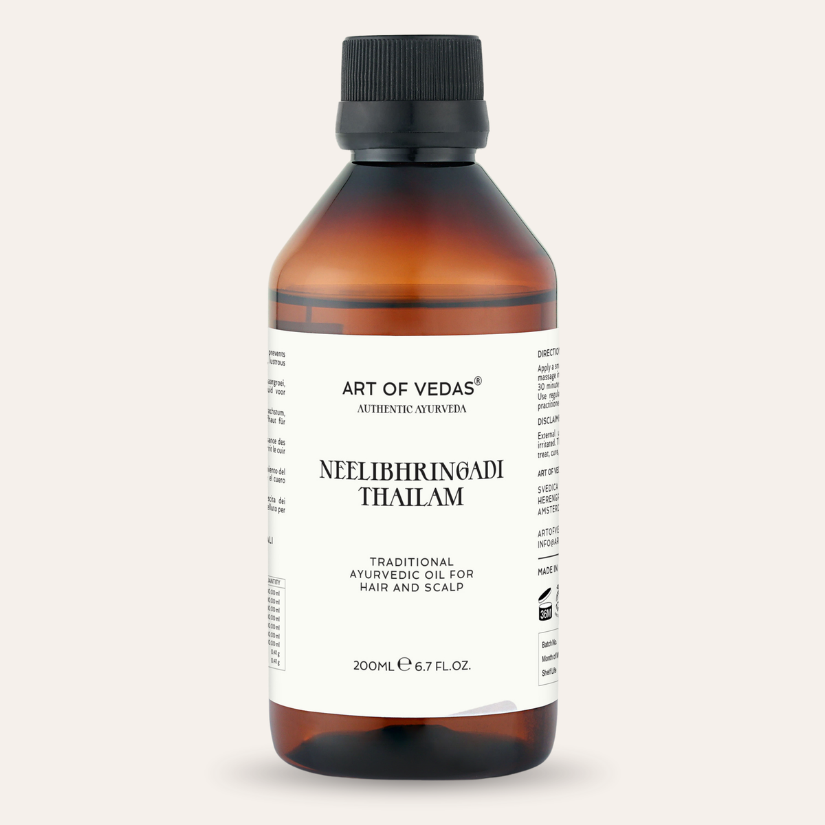Preparado numa base de óleo de coco puro usando o método clássico Sneha Paka Vidhi, Neelibhringadi Thailam penetra profundamente no couro cabeludo para acalmar a inflamação, remover acumulações e fortalecer o cabelo desde a raiz. É tradicionalmente usado no Shiro Abhyanga (massagem na cabeça) para promover clareza mental, sono repousante e brilho natural no cabelo.