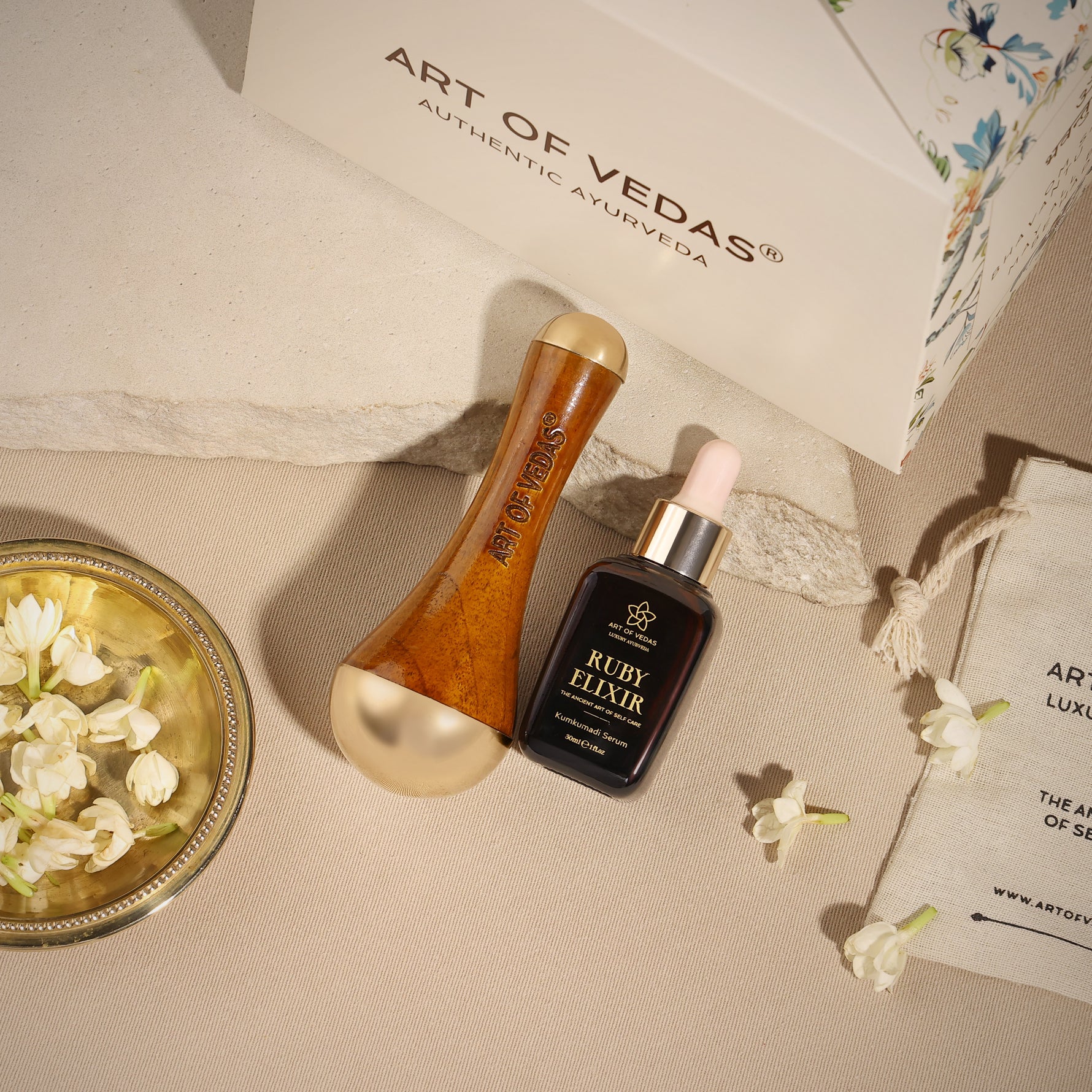 Comece o seu ritual diário ou semanal de autocuidado aplicando suavemente o Kumkumadi Serum no rosto e pescoço. Usando o Kansa Wand, realize movimentos rítmicos e circulares nos pontos marma do seu rosto. Esta técnica tradicional não só nutre profundamente a pele, como também harmoniza os doshas e promove o relaxamento.