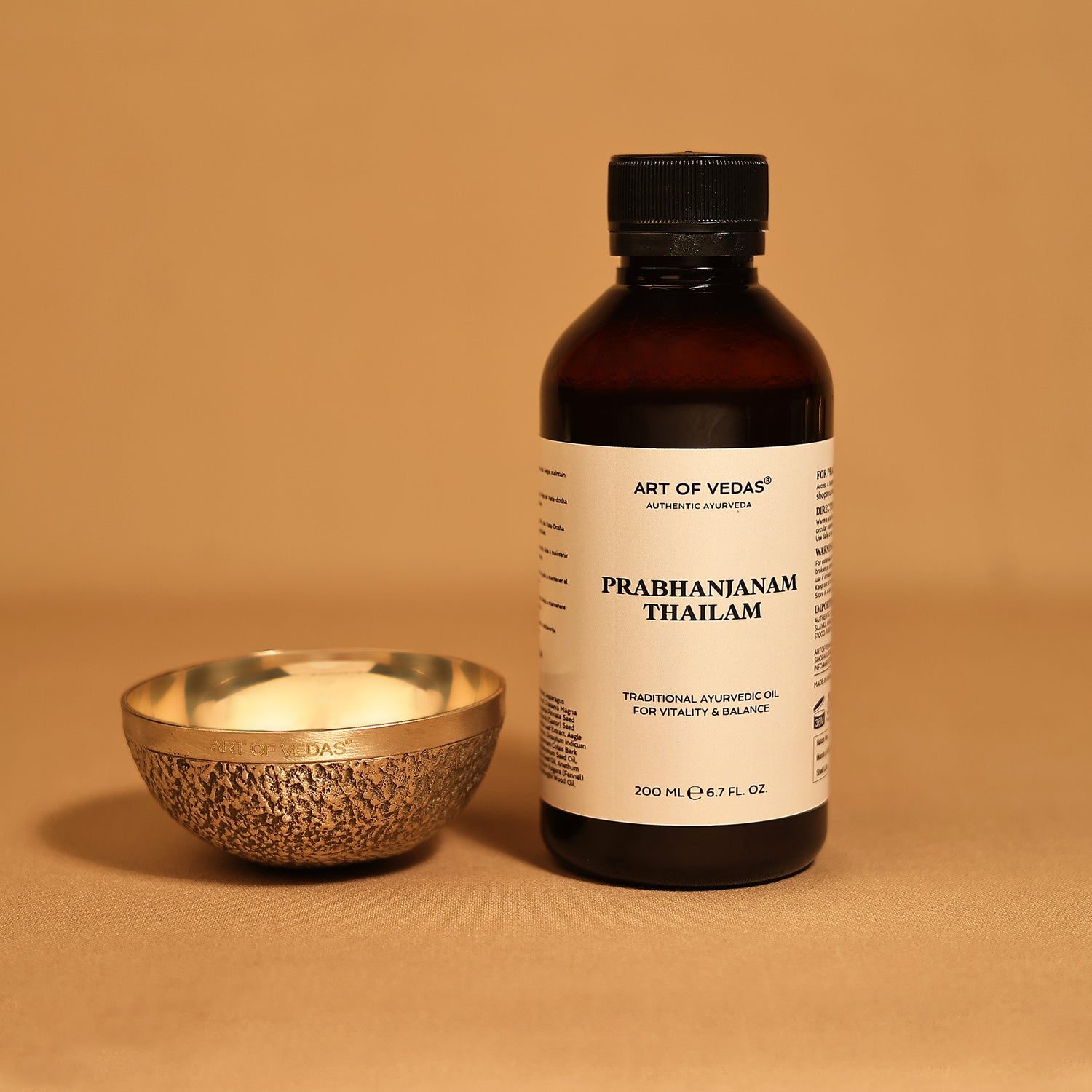 O Kansa Vatki necessita de uma camada generosa de óleo quente para deslizar pela sola sem fricção. O Dhanwantharam Thailam é o companheiro clássico para o Padabhyanga, aquecendo e equilibrando o Vata com uma nutrição herbal profunda que penetra na pele espessa dos pés. O Óleo de Massagem Vata oferece uma alternativa mais leve e aromática com patchouli e cedro para um ritual noturno de aterramento.