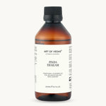 Bottle of Art of Veda Pinda Thailam oil on a beige surface with a pink flower and small bowl.